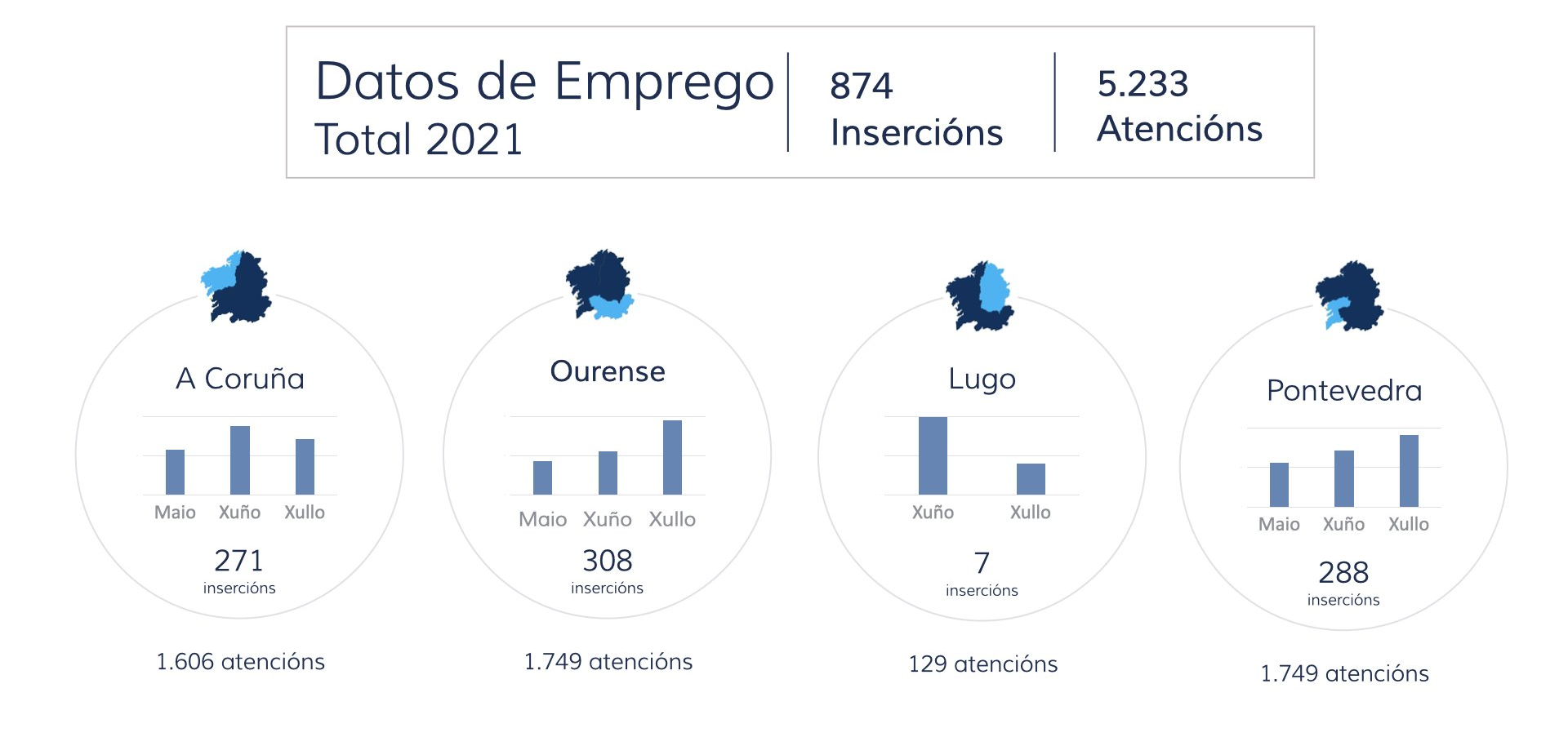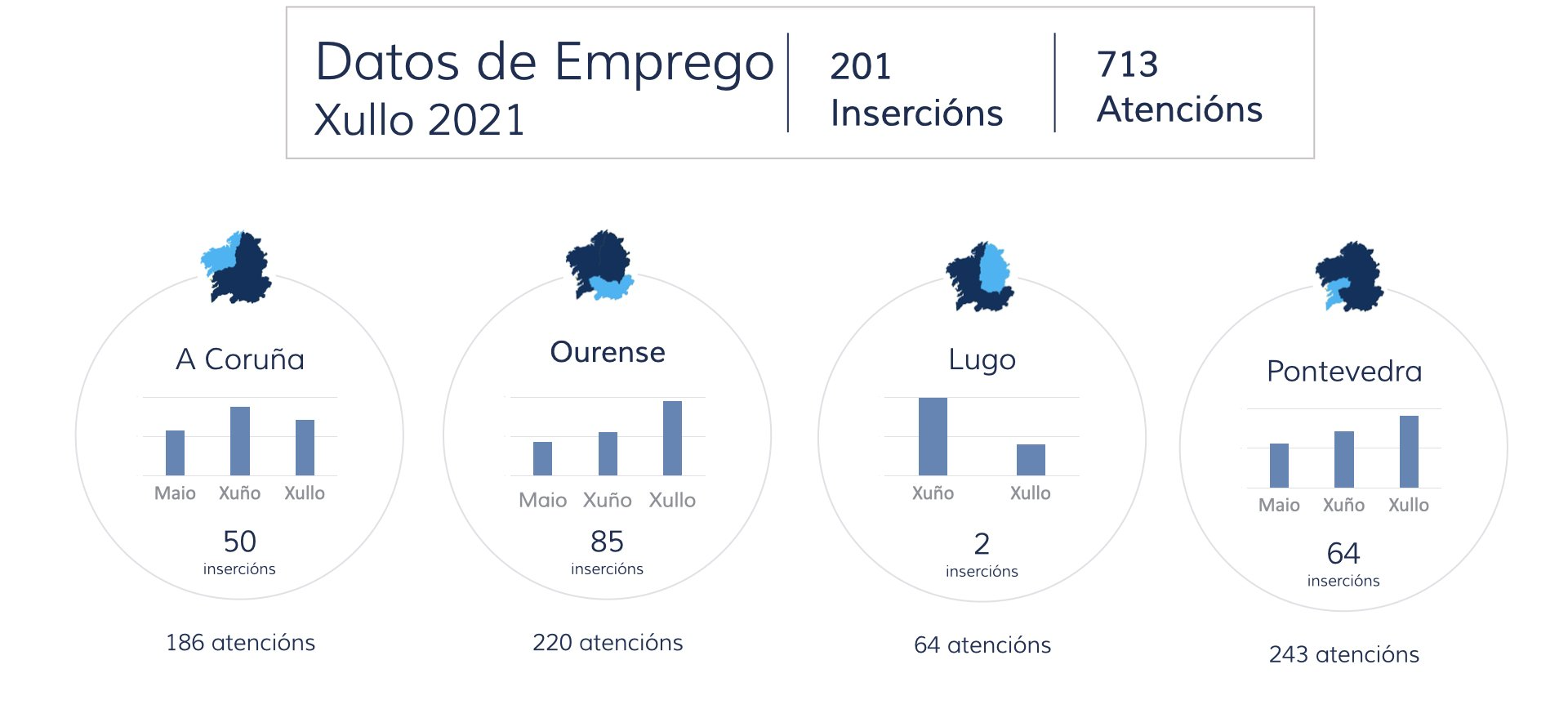 En Galicia, desde el departamento de Orientación Laboral de la entidad se realizaron 713 atenciones en el mes de julio consiguiendo la inserción de 201 personas. En este sentido cabe destacar el aumento de solicitudes recibidas a partir de la campaña de vendimia 2021.