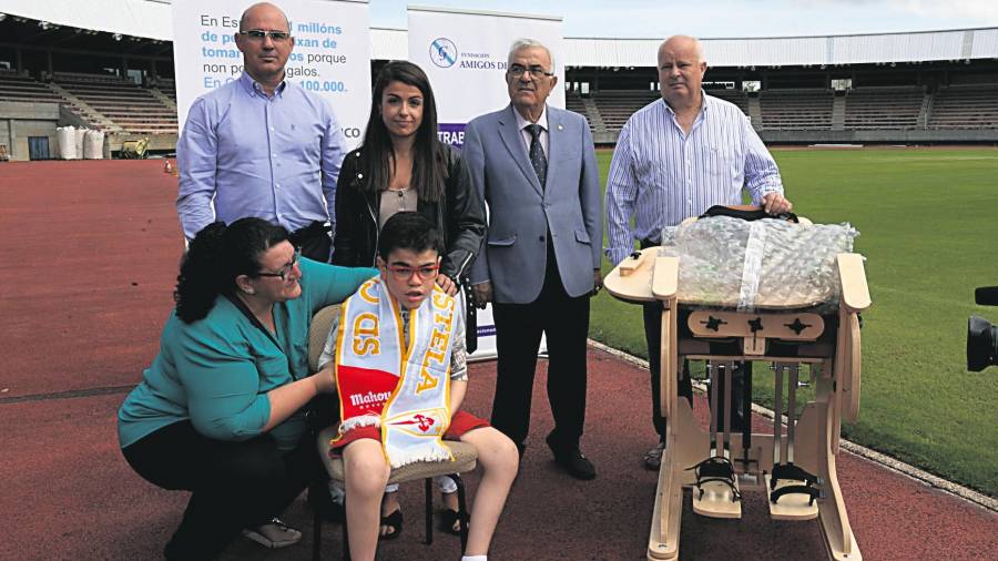 Jonatan Viver, con su madre, Sonia Deop, y varios representantes de la Fundación Amigos de Galicia y del Banco Médico Farmacéutico
