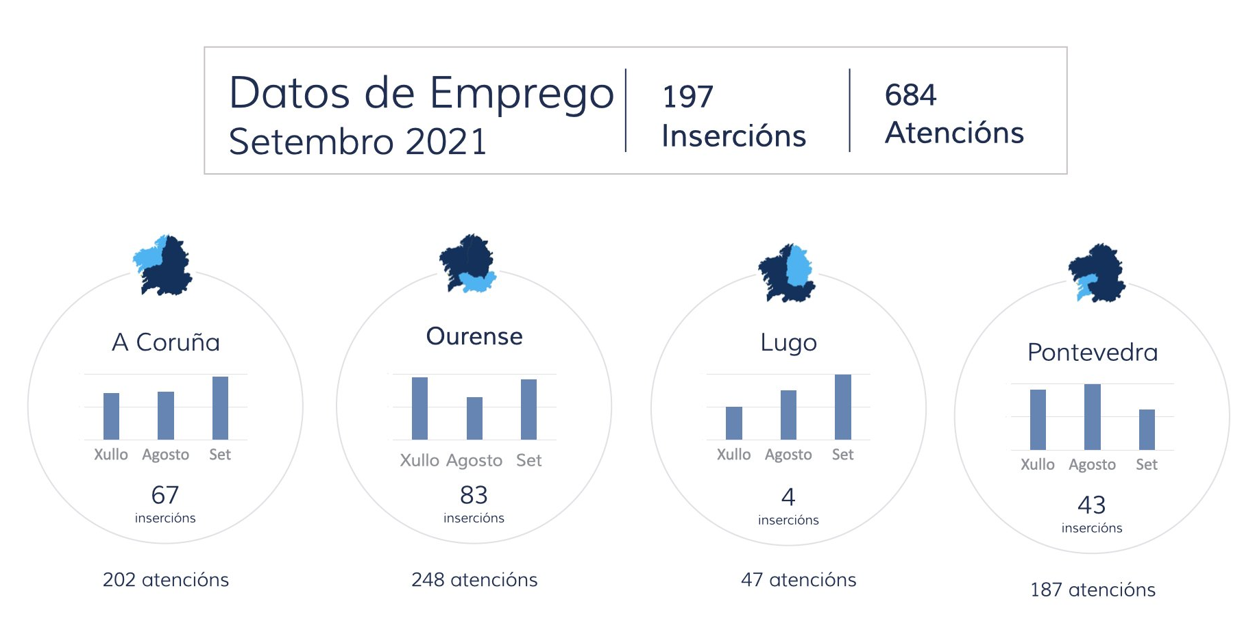 En Galicia, desde el departamento de Orientación Laboral de la entidad se realizaron en el mes de septiembre 684 atenciones consiguiendo la inserción de 197 personas.