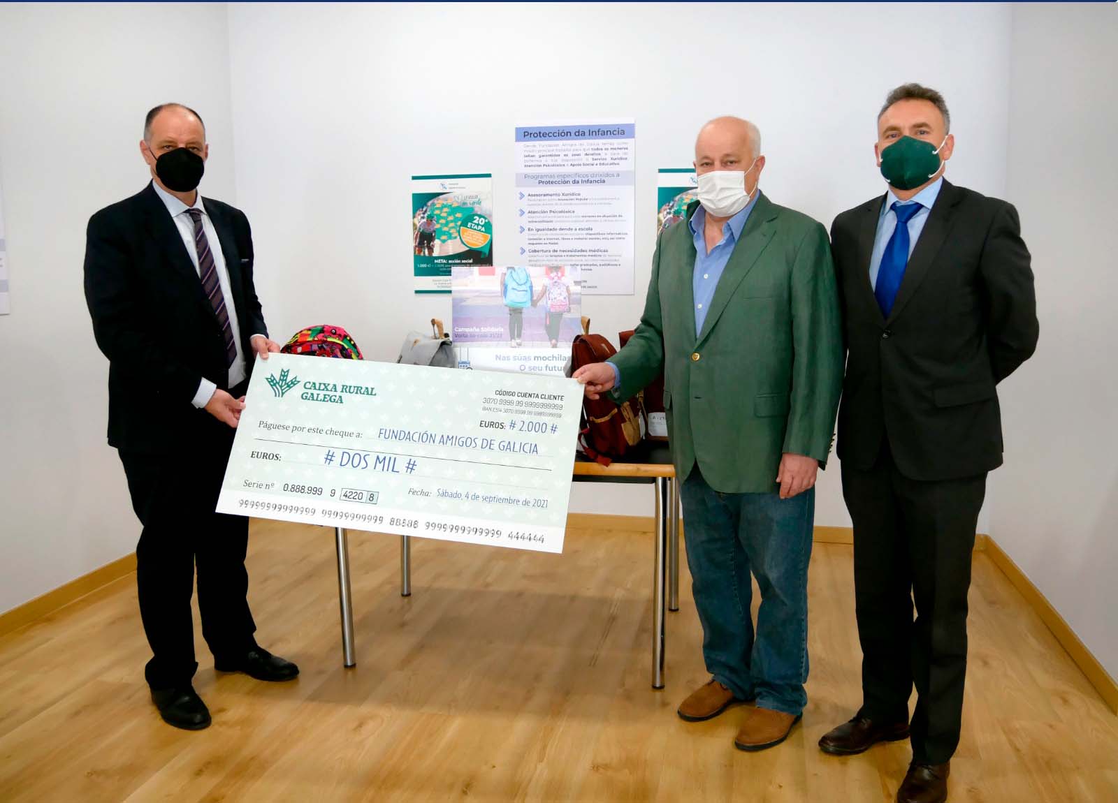 El director general de Caja Rural, Jesús Méndez Álvarez Cedrón; y el director comercial de la misma, José Manuel López Marcos; hicieron entrega esta mañana al director general de Fundación Amigos de Galicia, Jesús Busto Peteiro, de una donación de 2.000€ conseguidos tras superar el reto digital “La Vuelta en Verde”, impulsado por el equipo ciclista Caja Rural- Seguros RGA y sus patrocinadores principales con motivo de la Vuelta Ciclista a España.