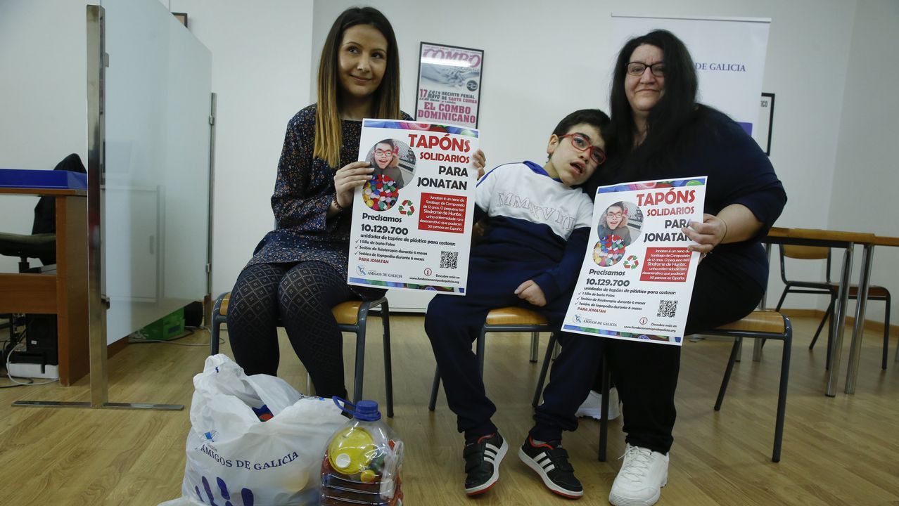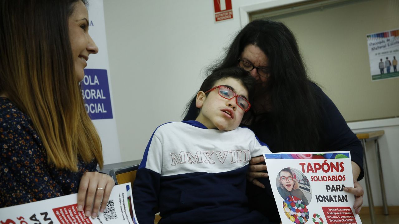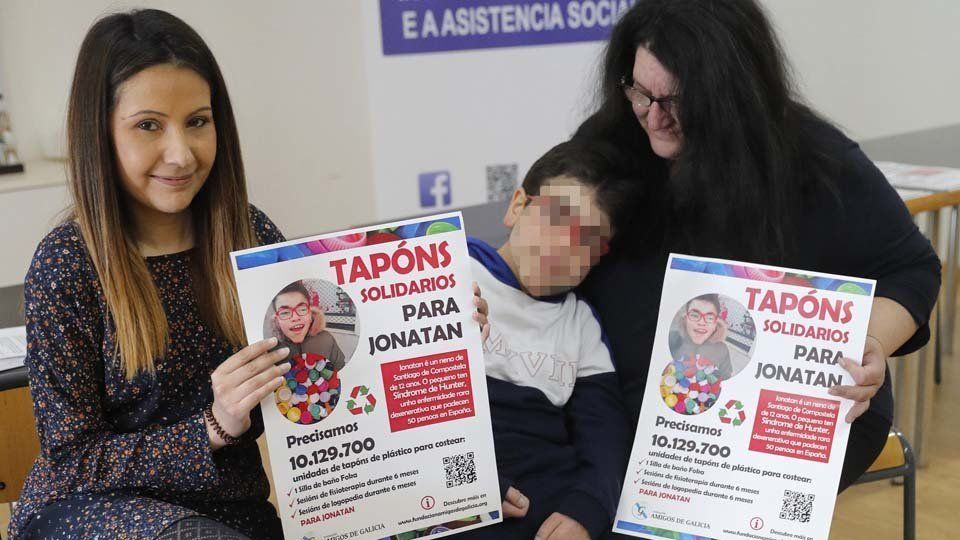 Así lo indicaron Noelia Romero, trabajadora social de la Fundación Amigos de Galicia, y Sonia Deop, la madre de Jonatan. Jonatan recibe tratamiento en el Hospital Clínico, del que la familia está satisfecha, para ralentizar el efecto de la enfermedad. Su madre indicó que esperan con expectativa que pueda llegar a aplicarse una terapia génica, probada con éxito en animales pero que aún no se utiliza en personas, y que se prevé mejorará su situación.Reunir 10.129.700 unidades de tapones: ese es el objetivo de una campaña solidaria promovida por la Fundación Amigos de Galicia y la familia de Jonatan Viver, un menor compostelano, de 12 años, que padece síndrome de Hunter, una enfermedad rara. Con la recaudación obtenida por los 14.471 kilos de plástico, destinados al reciclaje, se cubrirán seis meses de atención de logopedia y fisioterapia y se comprará una silla de ruedas para el baño. De ese modo mejorará su calidad de vida.
