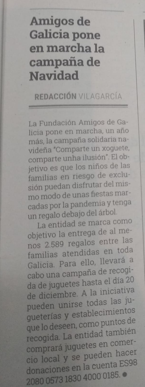 Para colaborar, Amigos de Galicia prioriza este año las aportaciones al número de cuenta ES98 2080 0573 1830 4000 0185. Con todo lo aportado se procederá a las compras en el comercio local como una forma de apoyar a reactivar la economía. Los interesados en aportar juguetes pueden ponerse en contacto en el mail comunicacion@fundacionamigosdegalicia.org o en el 672 706 182.