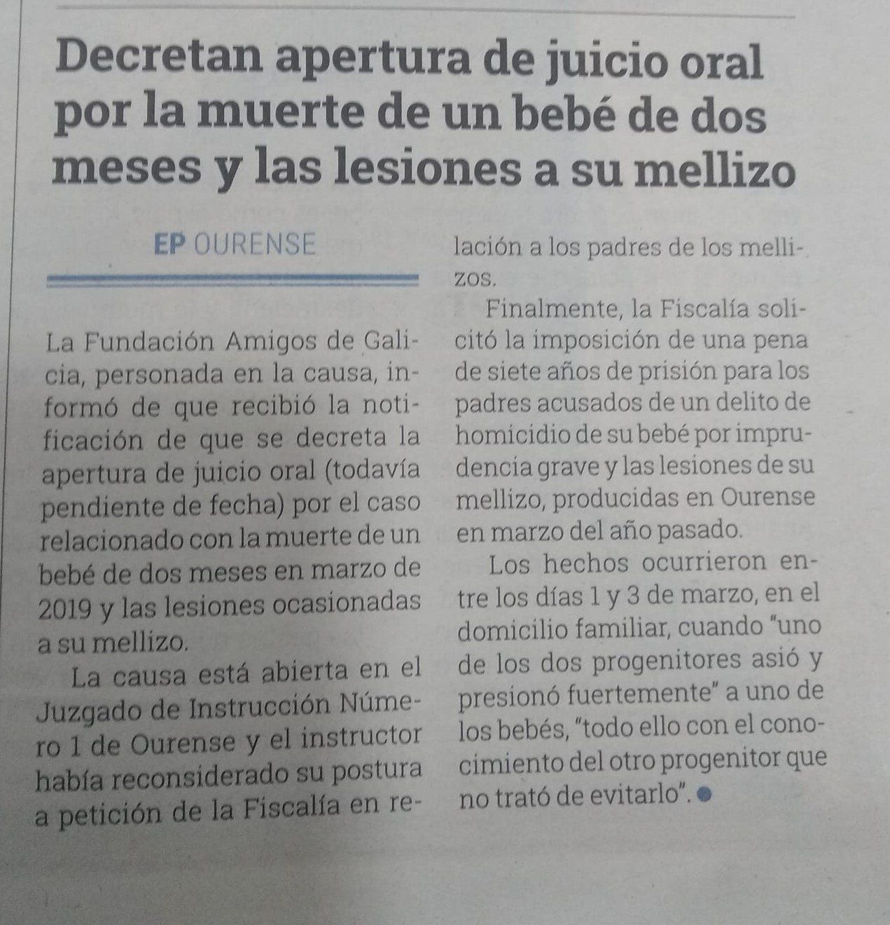 A causa está aberta no Xulgado de Instrución Número 1 de Ourense e o instrutor reconsiderara a súa postura a pedimento da Fiscalía en relación aos pais dos xemelgos. Finalmente, a Fiscalía solicitou a imposición dunha pena de sete anos de prisión para os pais acusados dun delito de homicidio do seu bebé por imprudencia grave e as lesións do seu xemelgo, producidas en Ourense en marzo do ano pasado.