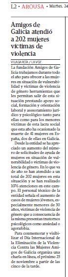 Amigos de Galicia atendió a 202 mujeres en situación de vulnerabilidad | El 25-N se conmemora mañana de forma “on line”