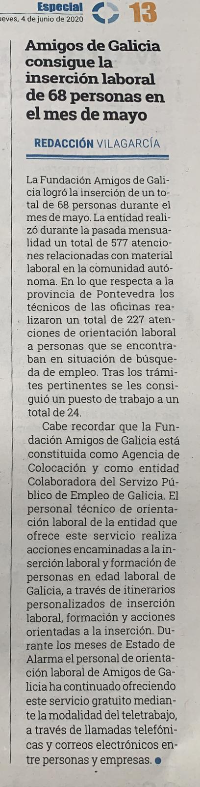 La Fundación Amigos de Galicia, que continúa trabajando de forma intensa durante el estado de alarma, ha conseguido durante el pasado mes de mayo la inserción laboral de 24 personas en la provincia de Pontevedra, resultantes de las 227 atenciones en este ámbito por parte del personal técnico.