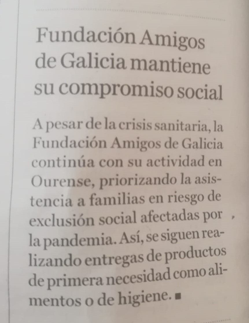 La Fundación Amigos de Galicia está entregando productos de primera necesidad, como alimentos perecederos y no perecederos, así como productos de higiene personal y de limpieza, a familias de Santiago. Se centran, fundamentalmente, en aquellas que tienen menores a cargo, mujeres víctimas de violencia de género y personas mayores que debido a la crisis sanitaria tienen dificultades económicas. La entrega se hace a domicilio o por medio de los servicios de reparto de las cadenas de alimentación. Uno de los problemas está en el acceso a productos perecederos.