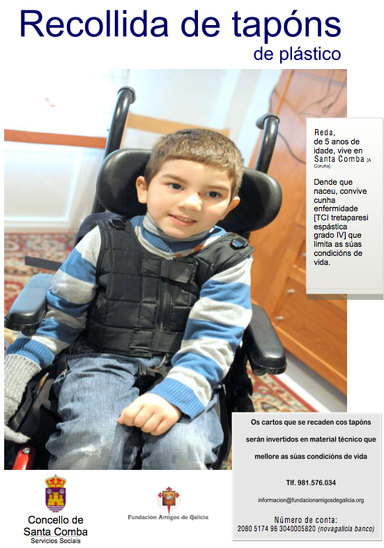 Reda é un neno de Santa Comba con parálise cerebral conxénita denominada "Tetraparisia Espástica" polo que precisa de diversos tratamentos e terapias que lle axuden a levar unha mellor calidade de vida.
